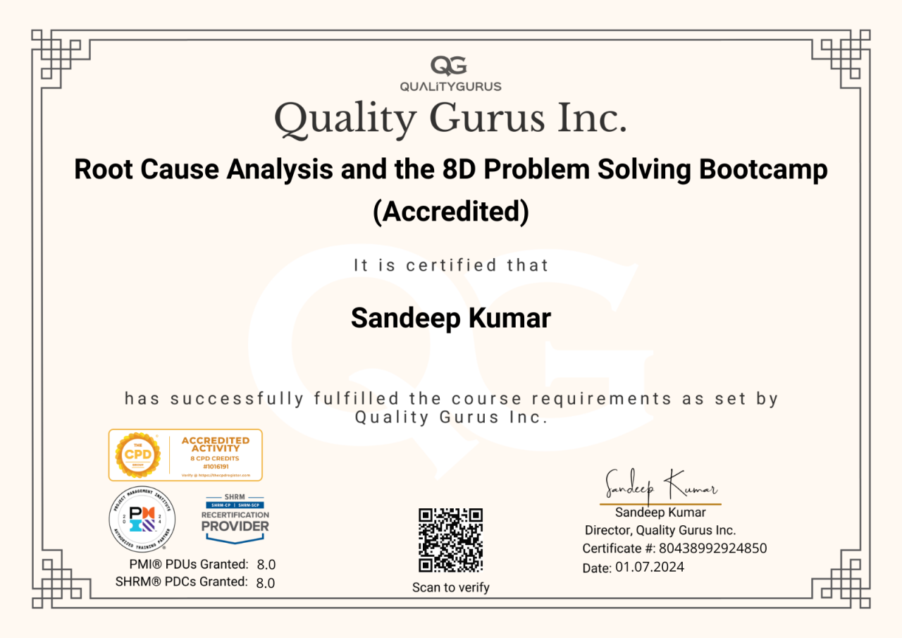 This is a certification exam for students who have successfully completed the Root Cause Analysis and the 8D Problem Solving course taught by Sandeep Kumar on Udemy.