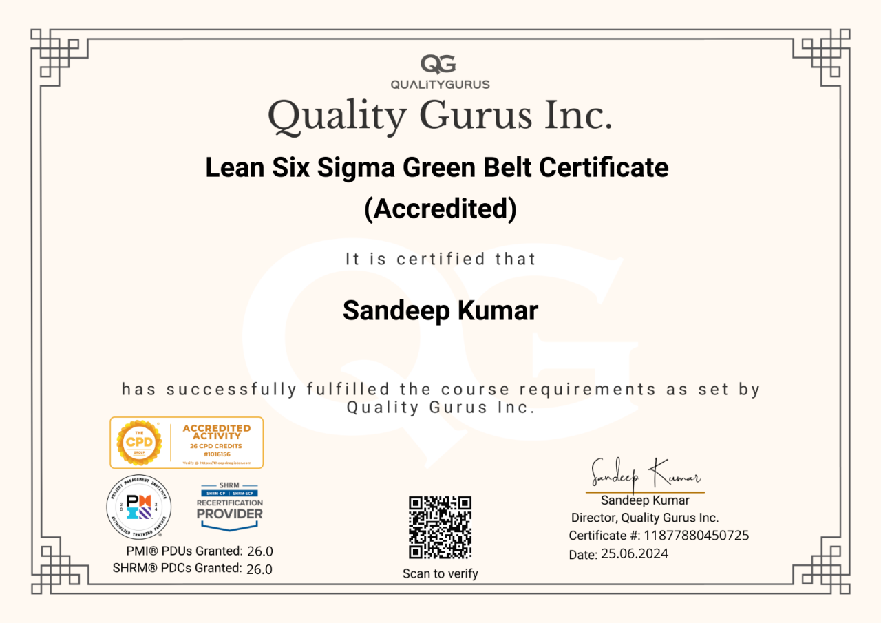 I started less than a month ago with the White Belt, and i was really interested, and i liked it a lot, so i moved on the Yellow Belt which i used to learn a lot of things, really a lot of new useful things and it prepared me for the Green Belt. And now with the Green Belt i have an even more deep knowledge on how to use lean tools, what there's behind a lot of concepts and how to measure and analyze especially. And i have to say that those were my favourite parts, really, i really spent a lot of time, day by day on the Measure and Analyze phase, because it was really something i was, and i'm still, incredibly interested into! Can't wait to use all these new things, tools, skills, i've learned in my company! Thanks Quality Gurus, Thanks Sandeep! So far it has been an amazing step by step journey and i don't want to stop!