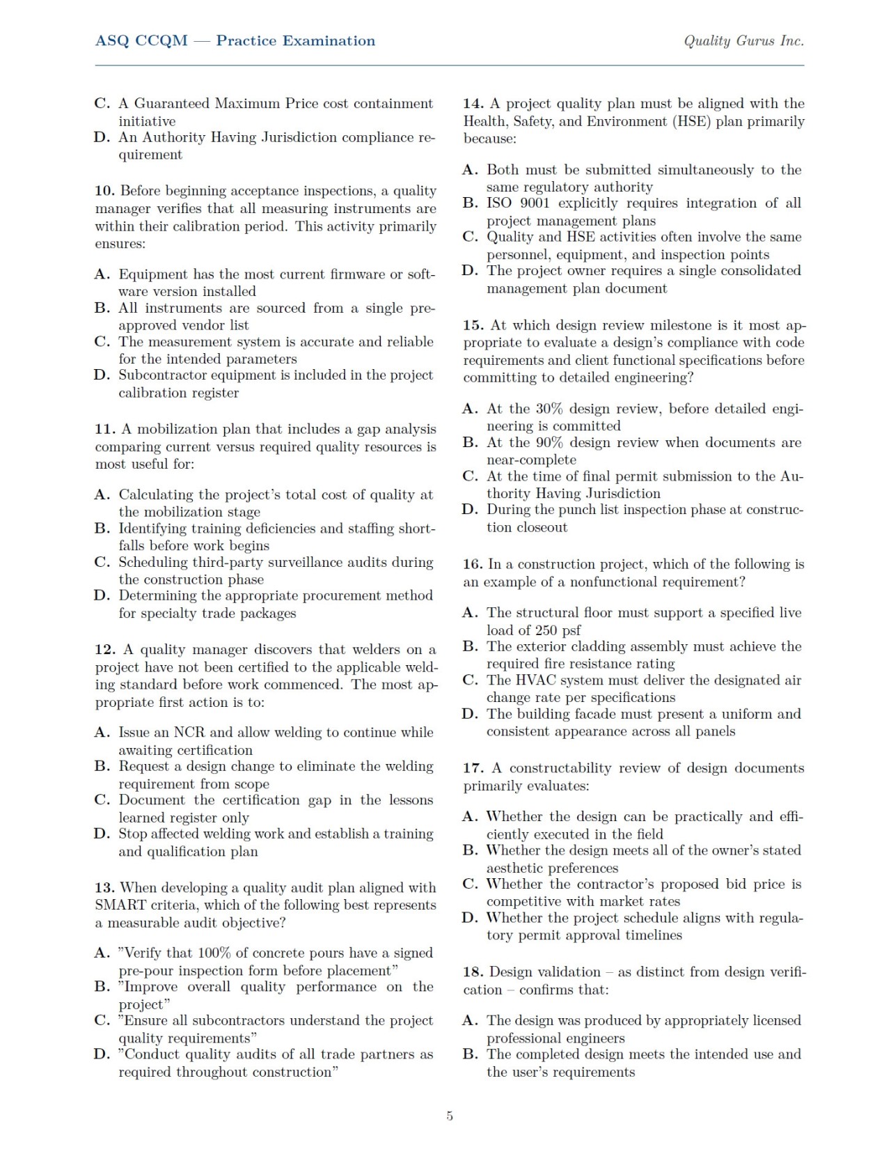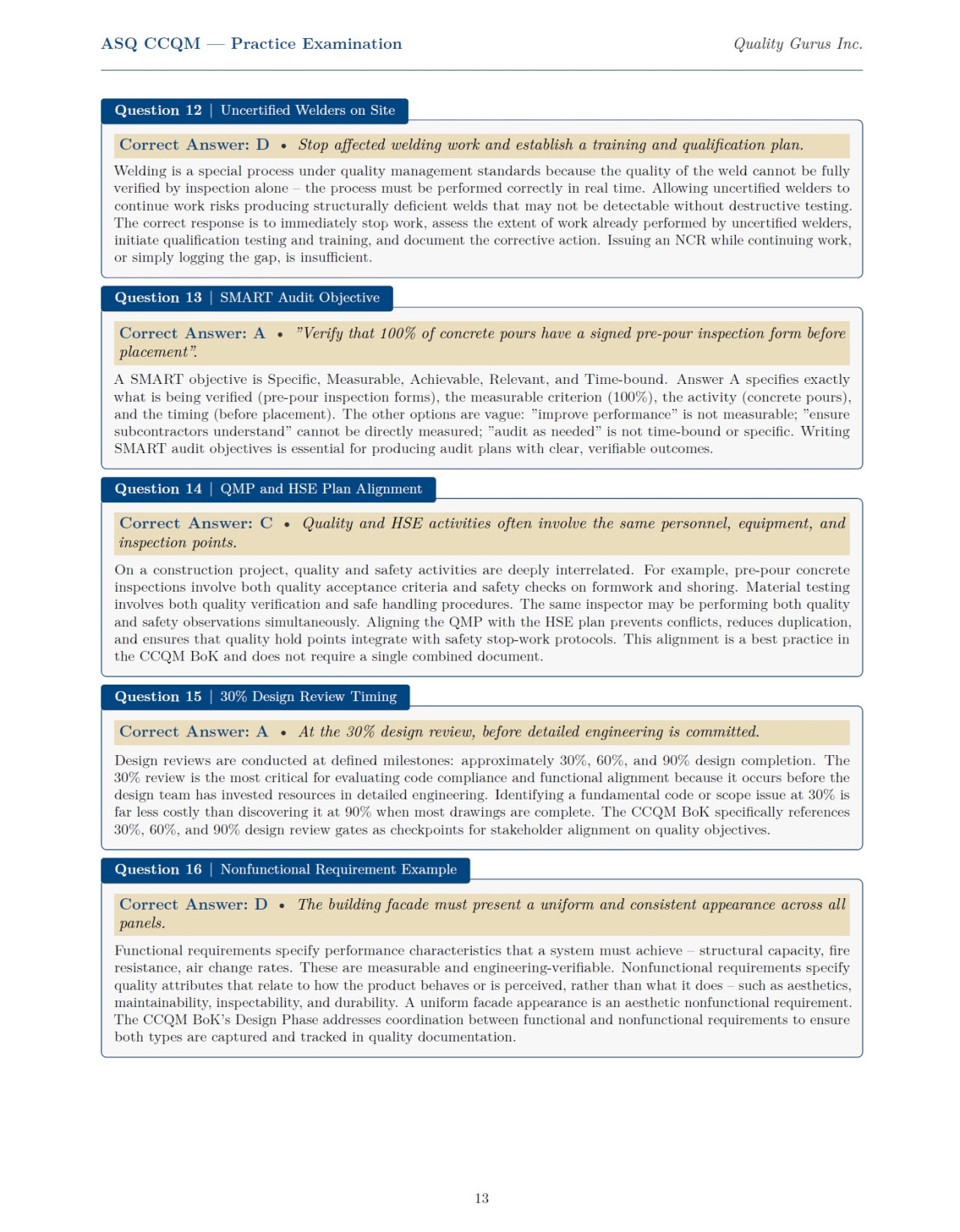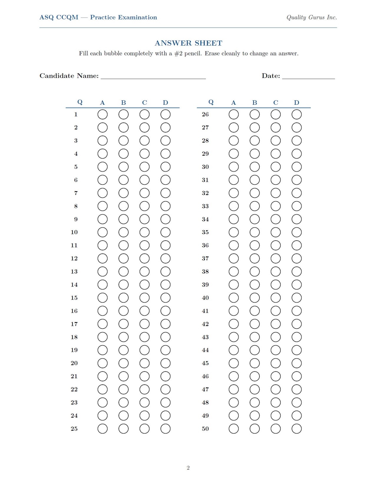 Practice test for ASQ CCQM exam containing 50 questions, correct answers and detailed explanations