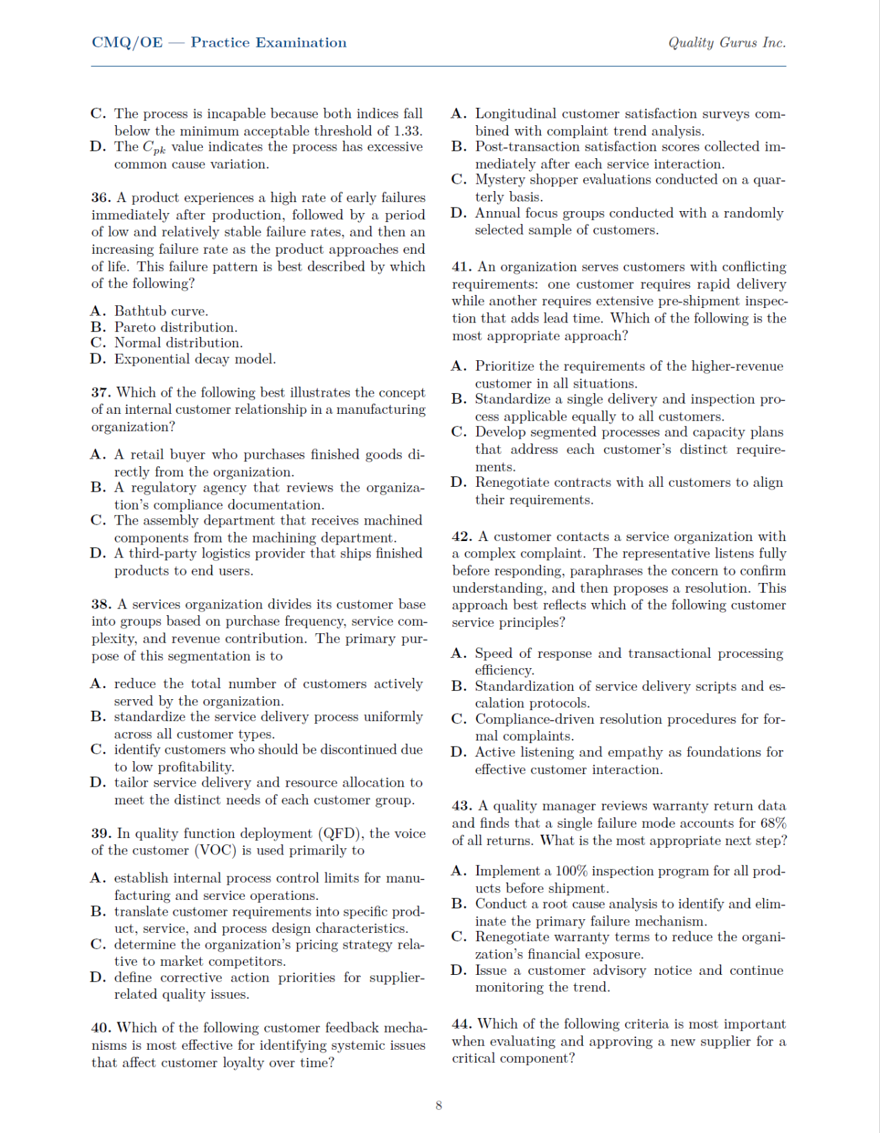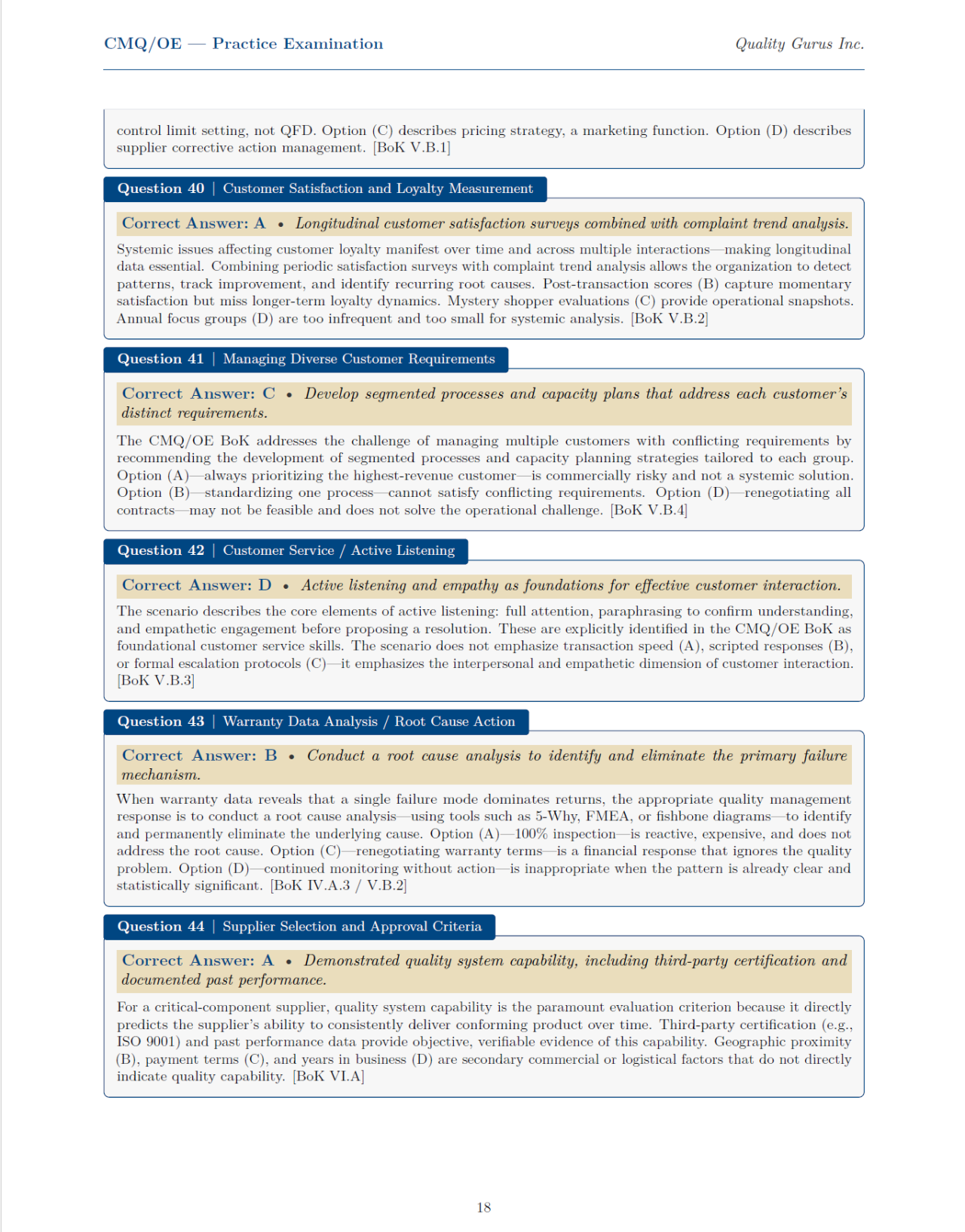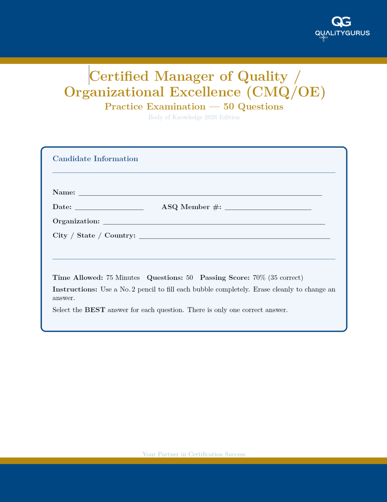 Practice test for ASQ CCQM exam containing 50 questions, correct answers and detailed explanations